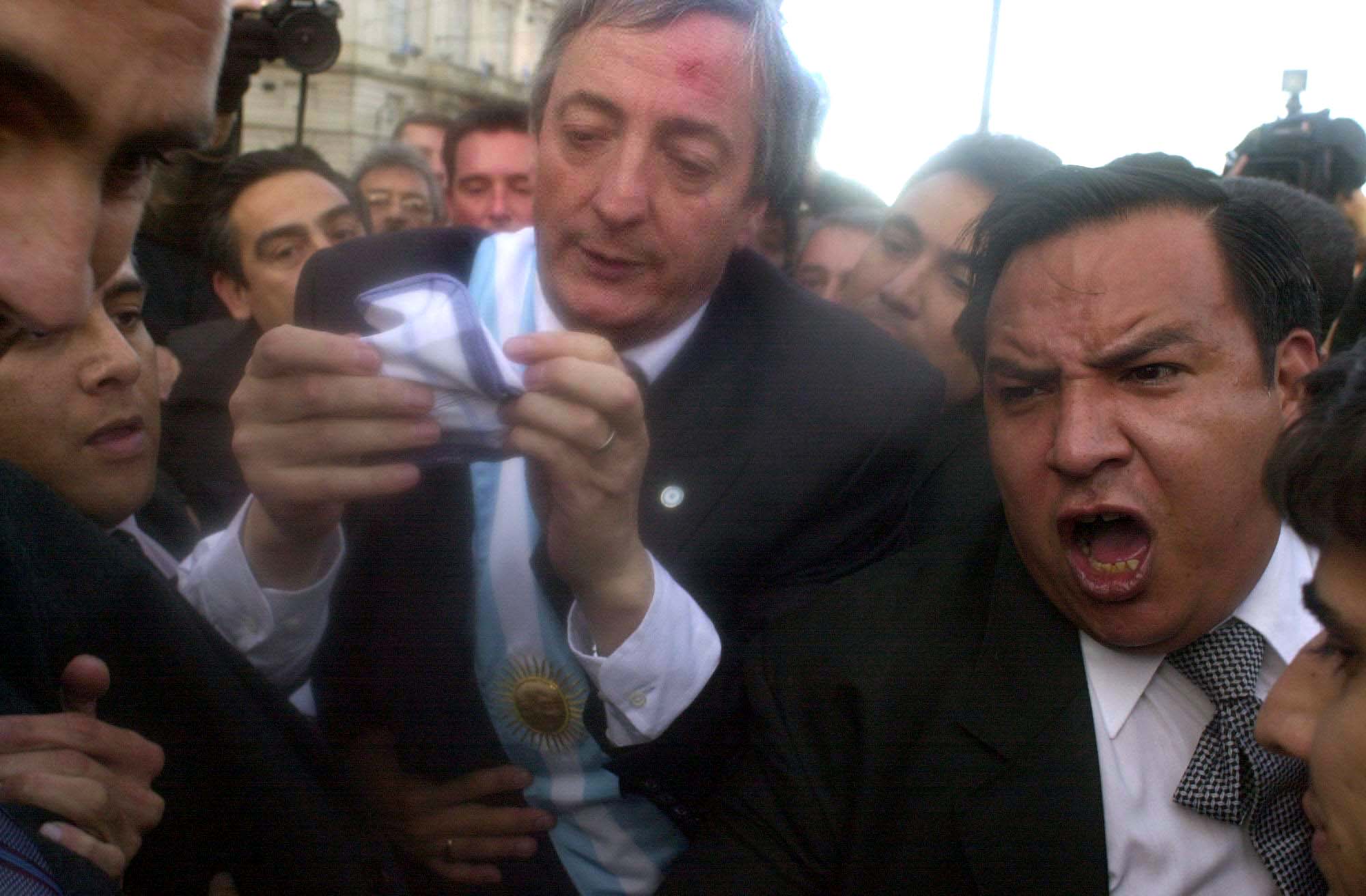13- Néstor Kirchner recién asumía la presidencia y decidió acercarse a la gente que fue masivamente a verlo. Un camarógrafo le abrió, literalmente, la frente en el forcejeo por lograr la mejor imagen.