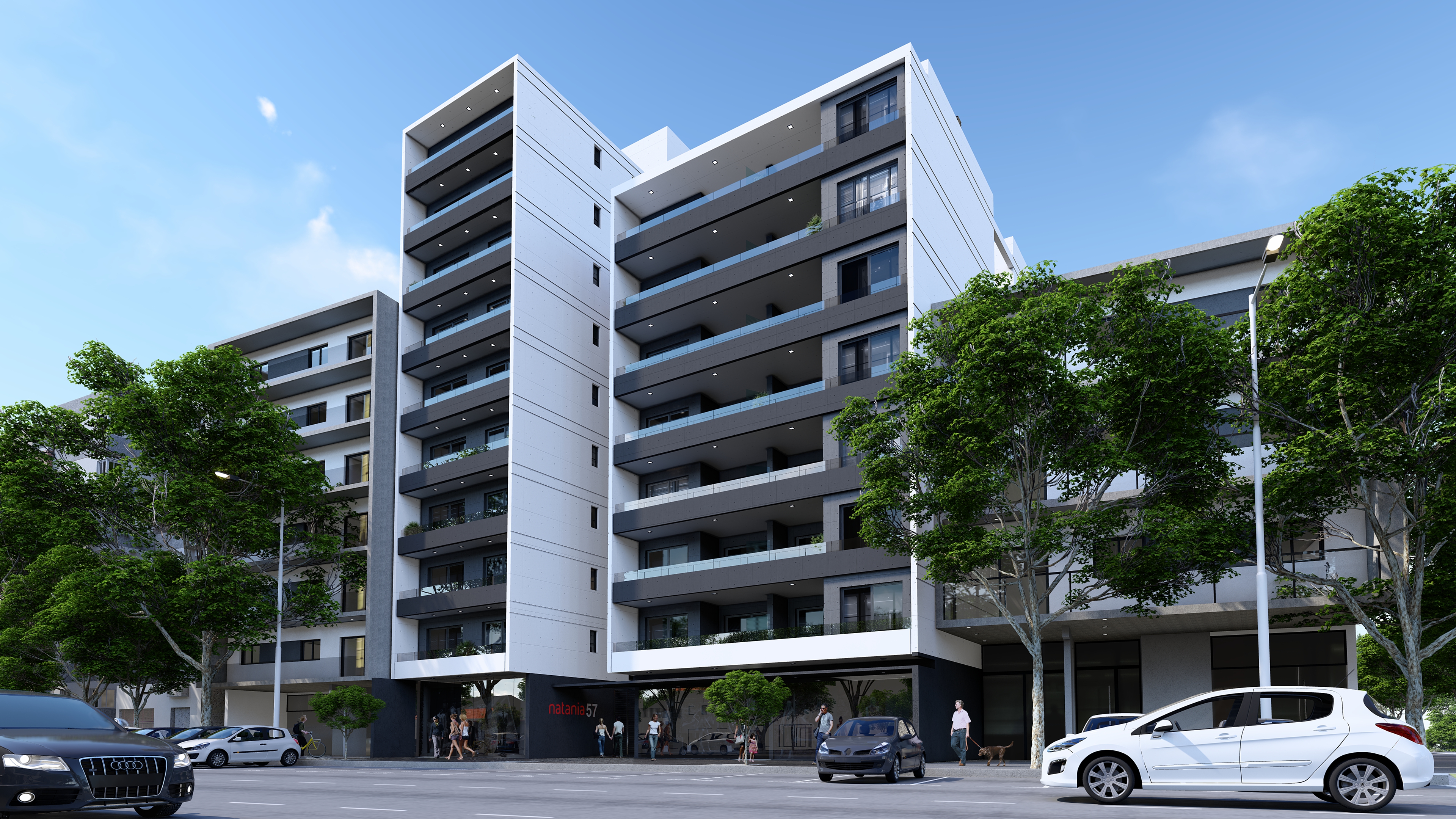 Ubicado en Av. Ignacio de la Roza Oeste 417, la torre Natania 57 contará con 85 departamentos de 1 y 2 dormitorios, 26 cocheras y 5 locales comerciales. Actualmente se encuentra en construcción y se prevé su entrega para el 2023.