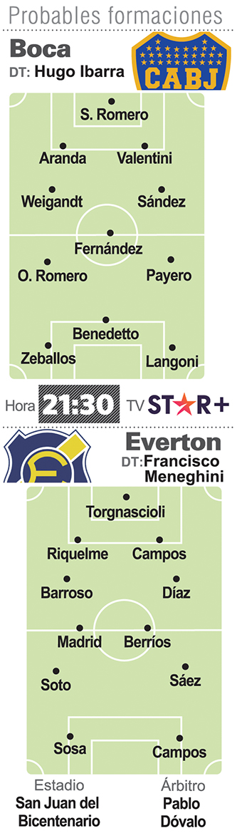 La formación del "Xeneize" que el DT Hugo Ibarra pondrá en cancha será con Sergio Romero; Marcelo Weigandt, Gabriel Aranda, Nicolás Valentini y Agustín Sández; Óscar Romero, Ezequiel Fernández y Martín Payero; Exequiel Zeballos, Darío Benedetto y Luca Langoni.