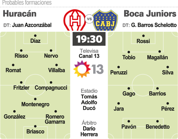 El Xeneize, que en los últimos 11 encuentros de visitante logró seis triunfos y cinco empates, lidera el certamen con 52 puntos, cuatro por encima de su escolta River, que tiene un cotejo pendiente frente a Atlético de Tucumán; mientras que Huracán, que hace cuatro partidos que no gana de local (una igualdad y tres caídas), está en el puesto 25to. con apenas 24 unidades. El líder del torneo presentará una sola modificación respecto del equipo que le ganó el pasado fin de semana a Newell’s por 1-0: Lisandro Magallán en lugar del lesionado Juan Manuel Insaurralde, quien se perderá lo que resta del torneo por un desprendimiento parcial del aductor mediano derecho. Además el mellizo Guillermo contará con el volante central Fernando Gago, quien el miércoles se retiró antes de la práctica debido a un cuadro de fiebre y vómitos, y el jueves directamente no estuvo en el entrenamiento. Por su parte, Huracán, que pelea por conservar la categoría, repetirá el equipo de las últimas dos fechas, con sendas derrotas ante San Lorenzo (1-0) e Independiente (2-1).