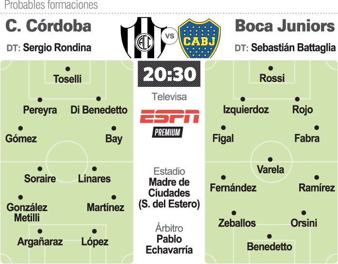 Boca inició el torneo local contra Arsenal con apenas dos de sus habituales titulares, Izquierdoz y Villa, luego incluyó mayoría de titulares en el triunfo del miércoles ante Ferro (1-0) por la Copa Argentina, y en Santiago tendrá los retornos del marcador central Marcos Rojo y el goleador Darío "Pipa" Benedetto, quienes fueron bajados del viaje a La Rioja por una medida disciplinaria. Sin los peruanos Luis Advíncula y Carlos Zambrano, ambos con su seleccionado que el lunes se jugará el ingreso al Mundial de Qatar, ni con el paraguayo Oscar Romero, citado por su Selección, y la baja por lesión de Eduardo "Toto" Salvio, Boca tampoco contará con Villa desde el inicio en Santiago del Estero. Battaglia decidió darle descanso por el estrés.