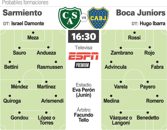 Boca Juniors, líder del torneo de la Liga Profesional y dueño de un invicto de doce fechas en el certamen, visitará hoy (16.30) a Sarmiento, que se aseguró la permanencia, en el inicio de la 25ta fecha.