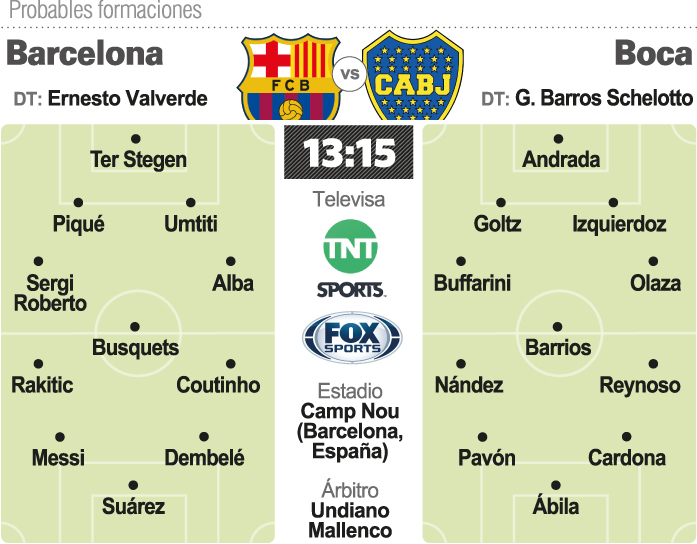 Boca y Barcelona dirimirán hoy (13.15 por Fox Sports Premium y TNT Sports) el histórico trofeo amistoso Joan Gamper. El bicampeón argentino será protagonista por sexta vez del campeonato que tendrá el Camp Nou como sede. Los equipos chocarán para definir al campeón amistoso tal cual marca la tradición con formaciones más que interesantes. Según se especula en España, Ernesto Valverde colocará en el terreno de juego a su formación ideal si es que no decide realizar variaciones en lo planificado a último momento. Messi enfrentará a un equipo argentino por tercera vez en su carrera tras toparse con Estudiantes y River. Cabe destacar que el técnico seguramente buscará darles minutos a los refuerzos, por lo que no sería ilógico ver en algún momento del partido al chileno Arturo Vidal, el francés Clément Lenglet y los brasileños Arthur y Malcom. Por el lado del "Xeneize", estarían apellidos como Julio Buffarini, Lucas Olaza y Nahitan Nández. Mientras que persisten las dudas entre Agustín Almendra y "Bebelo" Reynoso en el mediocampo.