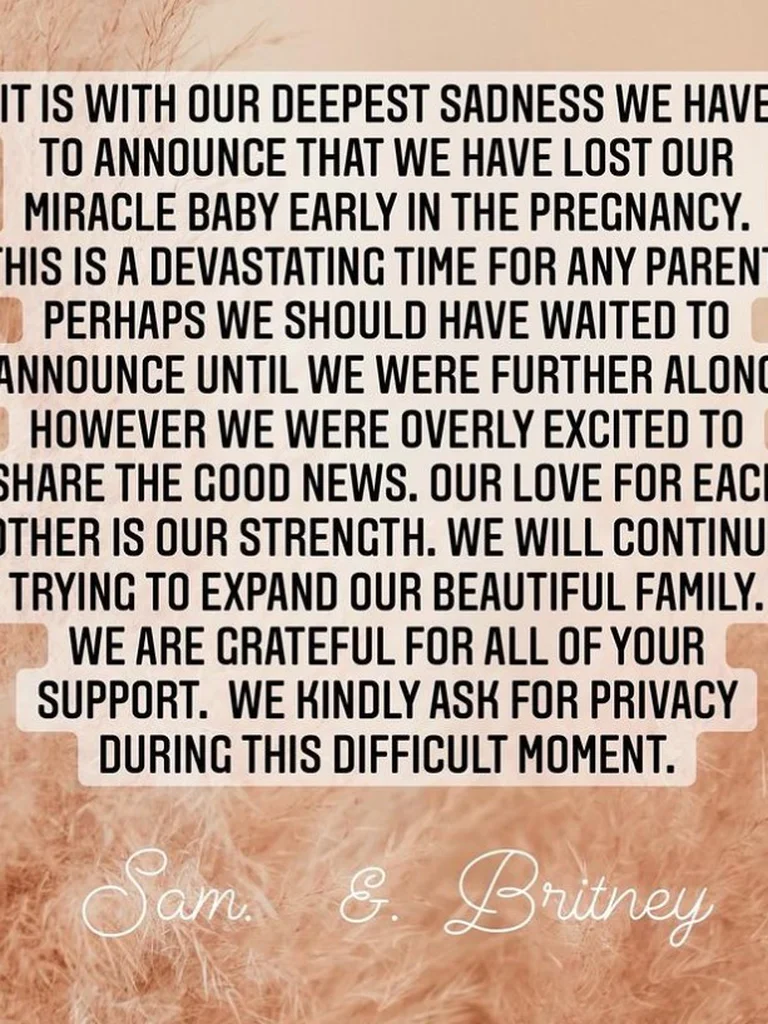 “Con una profunda tristeza tenemos que anunciar que perdimos a nuestro bebé en una etapa muy prematura del embarazo. Esto es devastador para cualquier padre”, se pudo leer en el comunicado. En el breve texto, Sam y Britney también explicaron que tal vez debieron esperar más tiempo antes de anunciar el embarazo: