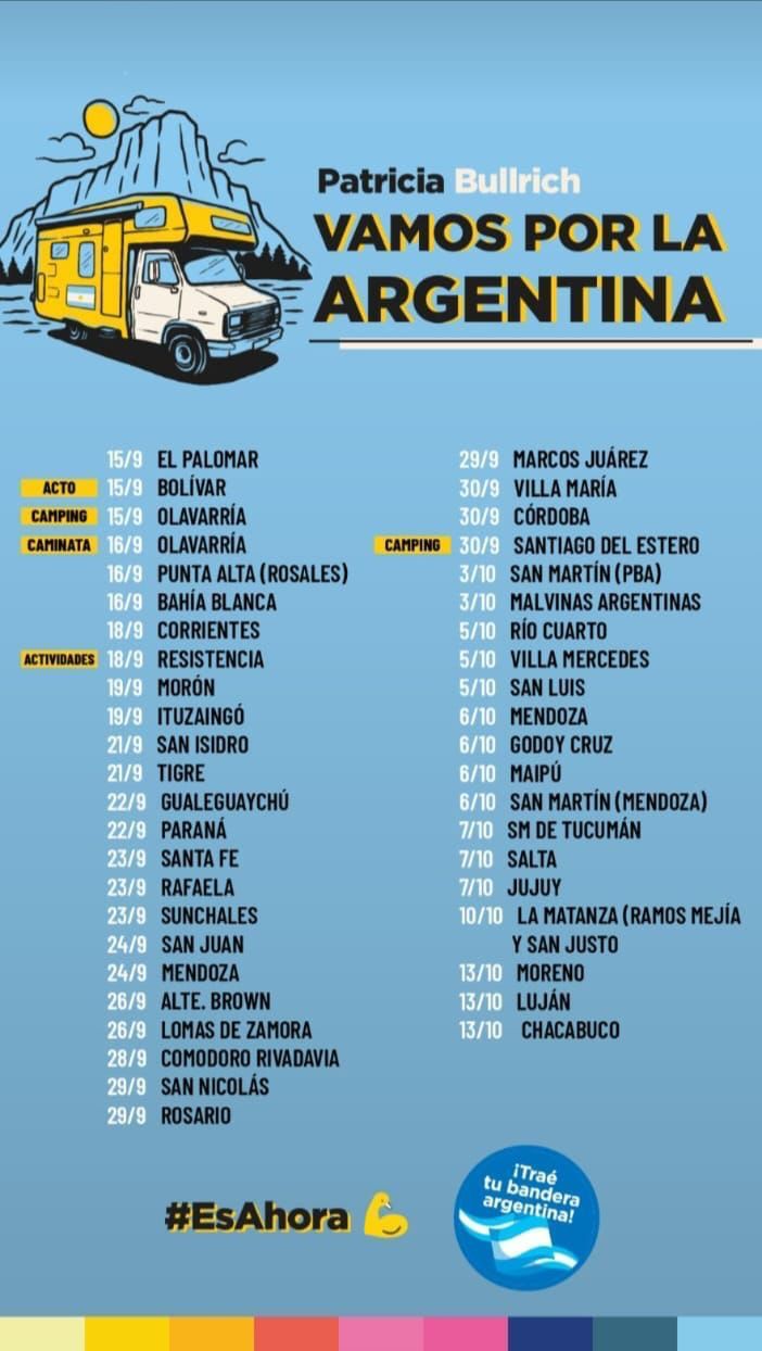 La candidata a presidenta de Junto por el Cambio, Patricia Bullrich, inicia hoy en El Palomar (Buenos Aires) una gira de campaña por buena parte del país que durara casi un mes, hasta el 13 de octubre, precisamente, y donde espera tocar unas 50 ciudades.