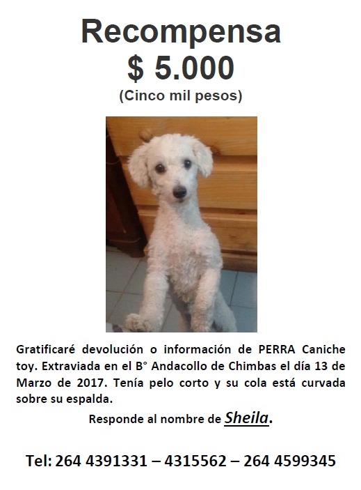Héctor Alejandro Gómez busca a su perra caniche toy, que responde al nombre de Sheila. "Ofrezco una recompensa de $5.000 a quien la devuelva. Se extravió el día 13 de marzo en el barrio Andacollo de Chimbas. Tenía pelo corto intermedio y su colita está curvada sobre su espalda".