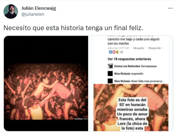La foto era parte de otra publicación, realizada en Facebook por ‘Lore Avecilla’ y en el que esta mujer pedía ayuda para dar con ese joven: “Esto fue en Huracán, en el 93. En la entrada veo al chico este, ninguno de los dos nos conocíamos, fue un cruce de miradas nada más. Adentro, en pleno recital, suena ‘Un poco de amor francés’, me paro en los hombros de un loco y me encuentro cara a cara con este chico”, asegura.