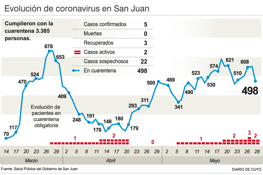 Así, San Juan tiene 2 casos con infección en curso, hay 22 sospechosos y ayer descartaron 98 por dar negativo.