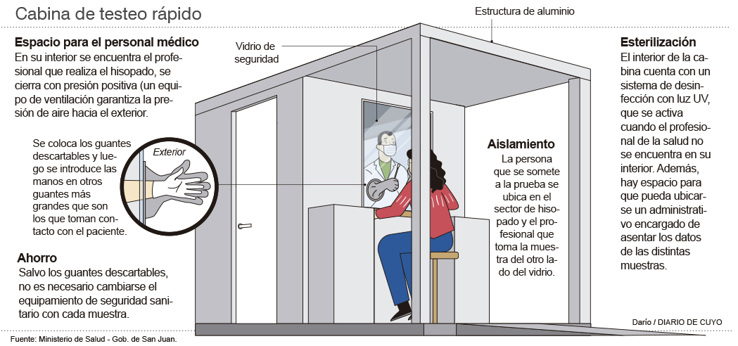 "Con las cabinas tendremos una menor pérdida de tiempo en el cambio de los elementos de protección personal de los especialistas que hacen los hisopados, pues sólo se reemplazarán los guantes. Además ya no habrá tantos agentes en las calles, que terminan extenuados al tener que ir a buscar a los casos sospechosos. Otra ventaja es que cuando entremos en una etapa más dura de la enfermedad tendremos rotación de este personal", indicó Benelbaz.