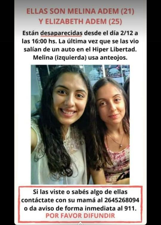 Familia, amigos y efectivos policiales iniciaron la búsqueda de dos hermanas. Se trata de Melina y Elizabeth Adem, de 21 y 25 años respectivamente, de las que no se sabe nada desde ayer en la tarde.