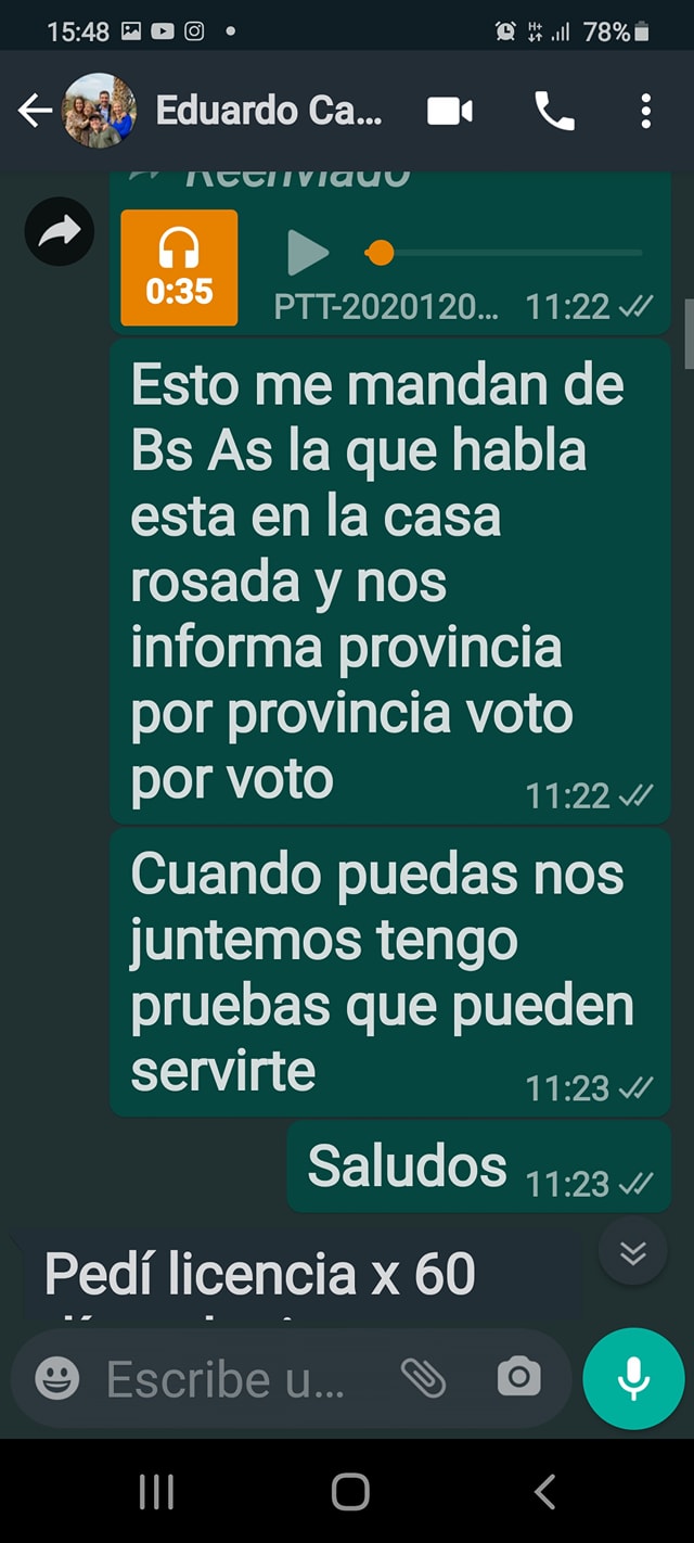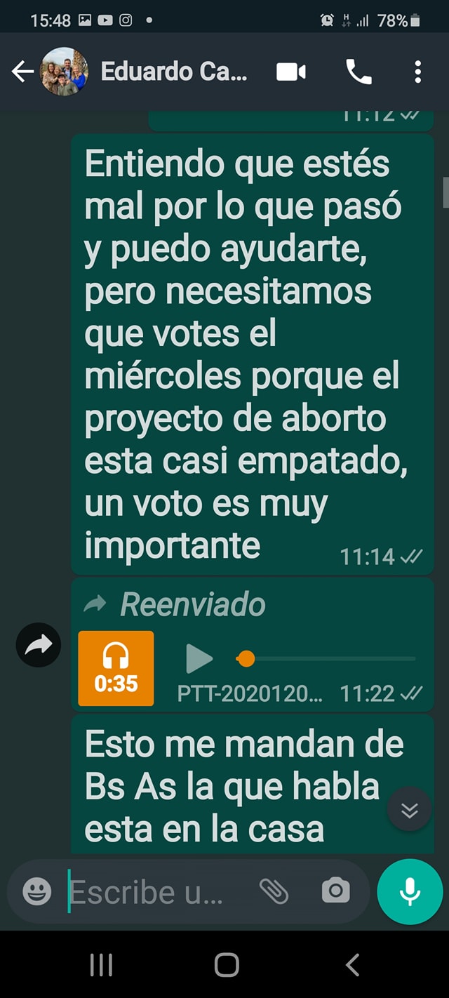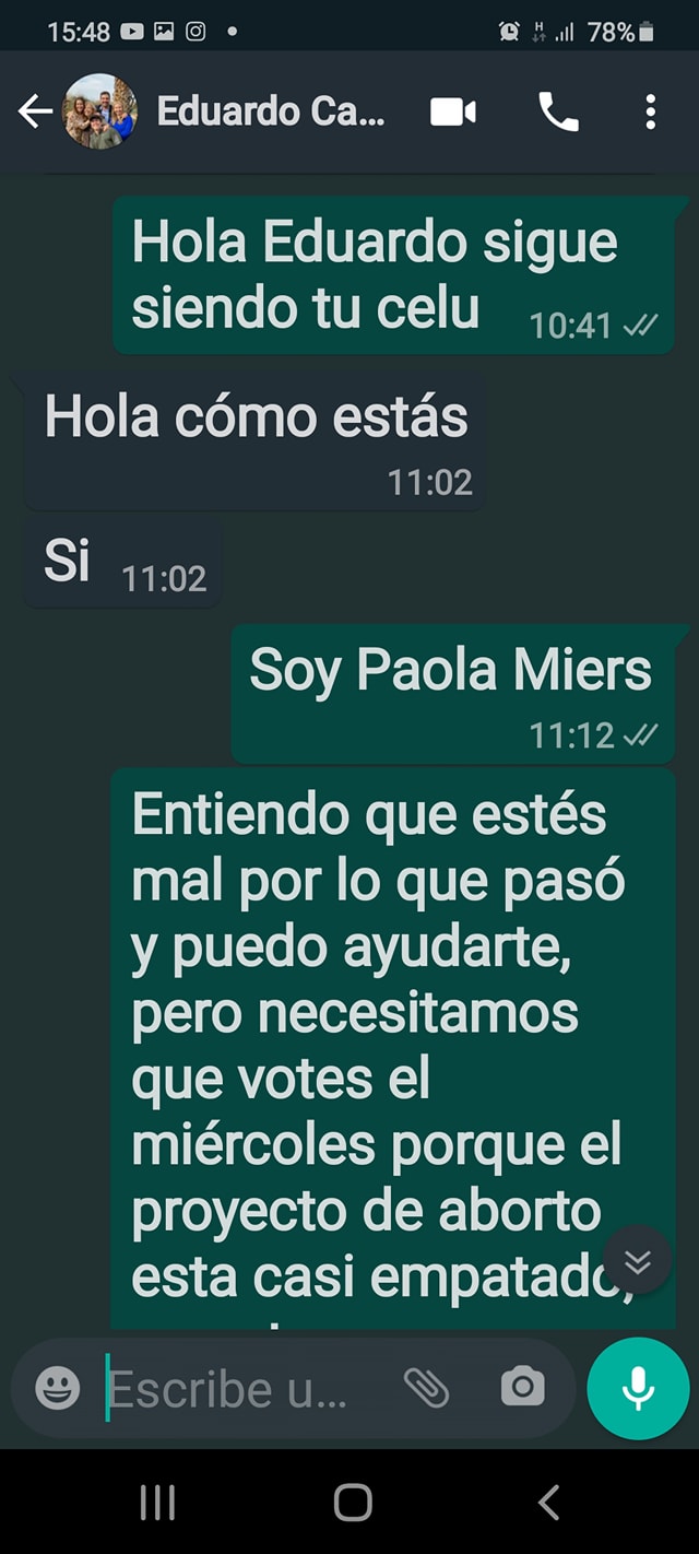 "El 8 de diciembre me comuniqué y hacia más de dos años no hablaba con el, por eso le pregunte si tenia el mismo número. Solo para decirle que necesitamos que vote y que lo ayudaríamos en redes para que pueda ejercer su derecho a votar. Las pruebas que pueden servirle es a los fines de expresarse en contra de este proyecto y tengo fotos, videos, textos para instruirlo en su exposición. El diputado no votó, porque el mismo pidió licencia. Un verdadero hombre no publica mensajes privados, ni ensucia públicamente para salvar su pellejo", prosiguió.