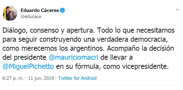 "Diálogo, consenso y apertura. Todo lo que necesitamos para seguir construyendo una democracia, como merecemos los argentinos. Acompaño la decisión del presidente @mauriciomacri de llevar a @MiguelPichetto en su fórmula, como vicepresidente", escribió en la cuenta del pajarito.