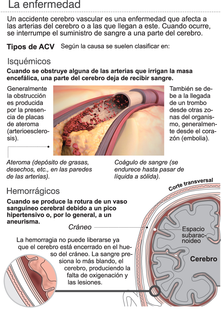 Un accidente cerebro vascular (ACV) significa una lesión cerebral con efectos devastadores para el individuo y su familia. En Argentina, sucede uno cada 4 minutos, es decir, unos 130 mil casos anuales. ACV, stroke, apoplejía, ataque cerebral, infarto cerebral, isquemia o derrame cerebrales son algunas de las formas en las que se conoce al accidente cerebro vascular que, en países como los EEUU o de Europa Occidental, ocupa el primer lugar como causa de discapacidad y el tercero como causal de muerte.