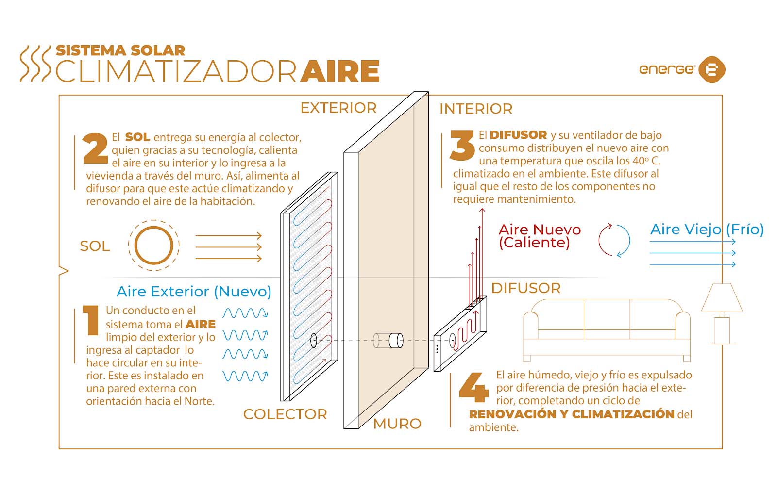 El sistema toma aire limpio del exterior (por medio del captador), lo traslada por un filtro y lo somete a un proceso de elevación de temperatura dentro del panel térmico diseñado exclusivamente para calentamiento de aire. Una vez culminado este proceso, lo devuelve al ambiente -en este caso, interior- con una temperatura que oscila los 40º C.