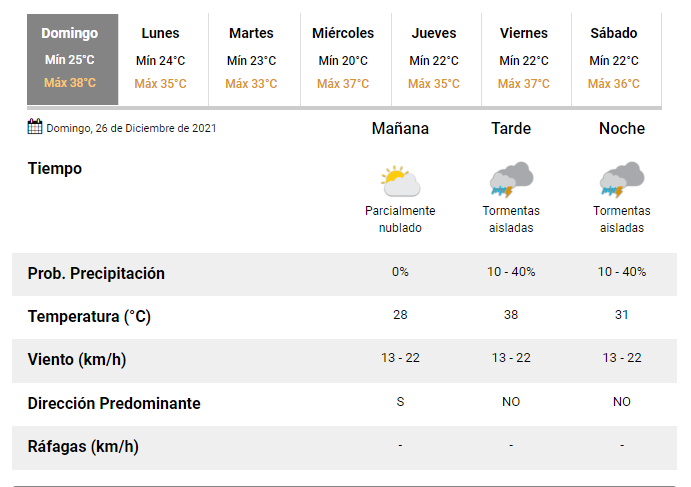 Este domingo, post Navidad se presentará con altas temperaturas y tormentas por la tarde-noche. Según lo que informa el Servicio Meteorológico Nacional, para este día se prevé una máxima de 38°C mientras que la mínima caerá hasta los 25°C.