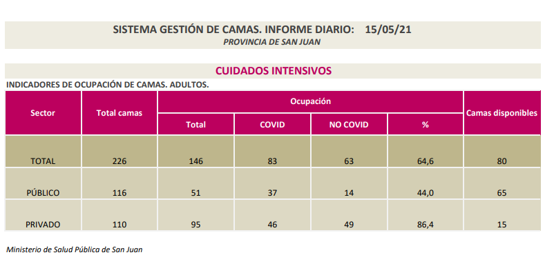 Además, en el sector público hay 37 camas con pacientes con Covid-19 mientras que los internados con otras enfermedades ocupan 14 plazas, quedando disponibles 65.