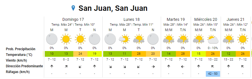 Según el Servicio Meteorológico Nacional en San Juan se aguarda para este domingo una temperatura mínima de 10 grados y una máxima de 24. Sin probabilidades de lluvia, las brisas de viento no superarán los 10 kilómetros por hora e irá cambiando su procedencia.