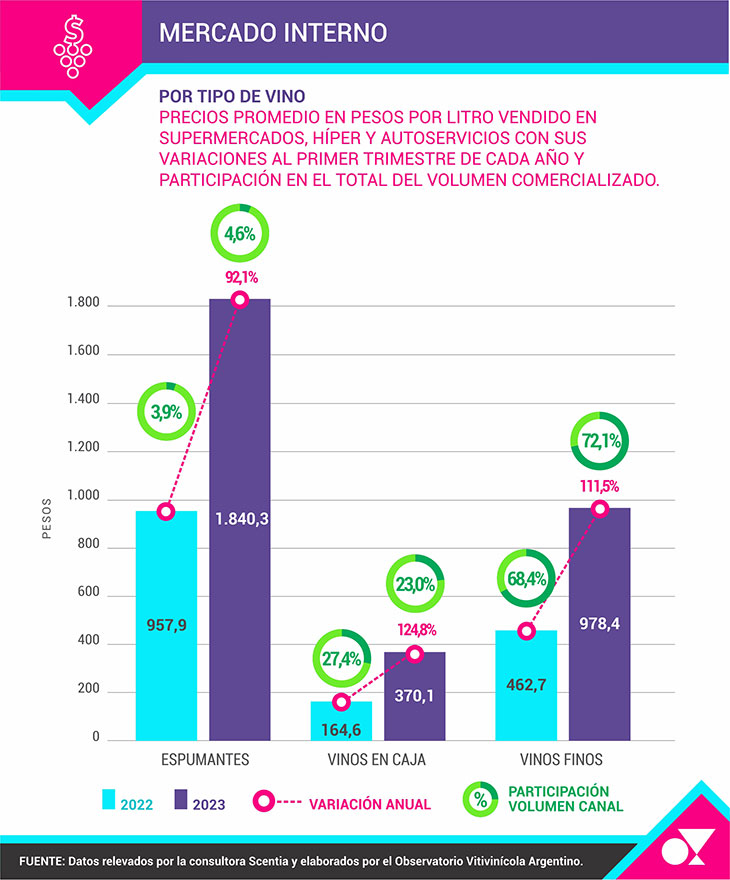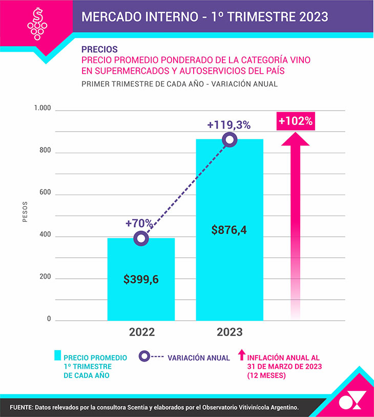 Según datos relevados por la consultora Scentia en hipermercados, supermercados y autoservicios del país al primer trimestre de 2023, el precio promedio por litro de vino vendido llegó a $876,4, lo que marca un aumento interanual del 119,3% en comparación al precio promedio por litro de vino vendido en el primer trimestre de 2022 que fue de $399,6.