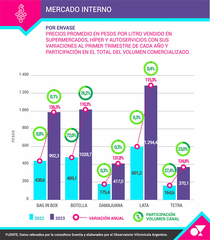 Por tipo de envases, la damajuana es la que más subió con un aumento del 137,8%, seguido del bag in box con el 126,3%. En tercer lugar, el que más aumento fue el multilaminado o tetra que incrementó su precio por litro un 124,8%, seguido de la lata que subió 115,3% y por último la botella que ajustó al alza su precio promedio un 110,3%.