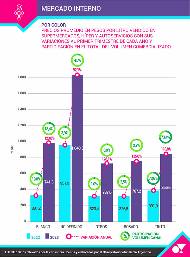 Por color, los vinos rosados aumentaron 135% en el período y ganaron participación de mercado al pasar de representar el 2,5% al 2,7% del total. Los vinos blancos ajustaron sus precios de venta en el primer trimestre del 2023 un 123,8% contra igual período de 2022, aunque perdieron levente mercado al pasar del 19% del total de las ventas en volumen en 2022 al 18,4% en el primer trimestre de 2023.