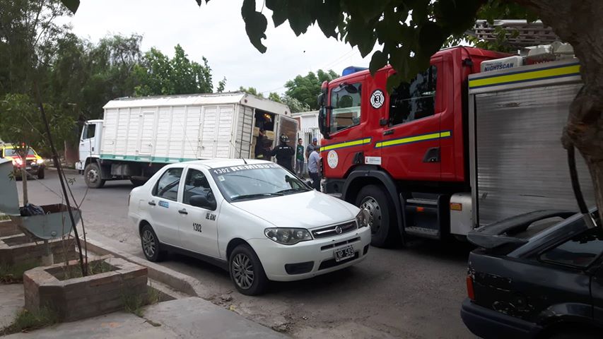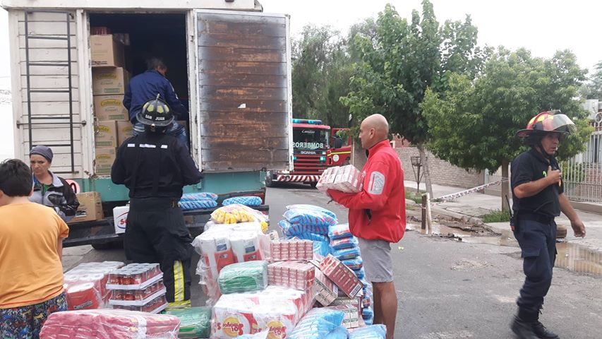 Finalmente, una dotación de Bomberos Voluntarios de Chimbas ayudó a la familia rawsina a descargar los elementos del camión para posteriormente sacarlo del pozo provocado por la rotura de años de agua.