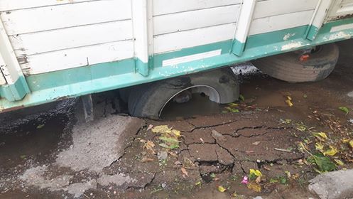 Este lunes al mediodía un camión de una empresa familiar, del rubro de distribución, comenzó a hundirse en el asfalto inmediatamente luego de ser estacionado. La razón es que hay caños de agua rotos que hicieron que la calle ceda por el peso y el propietario del vehículo aseguró que iba a darse vuelta en cualquier momento.