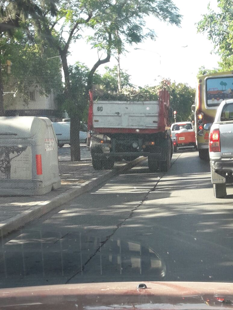 Un lector envió una imagen y el siguiente comentario: "Un camión de la Municipalidad de la Capital, Av Rioja y Av Córdoba, 9:15 horas, trabajando de una manera particular ¿puede circular así? y además ¿a plena hora pico lo tienen que hacer para entorpecer el tránsito?".