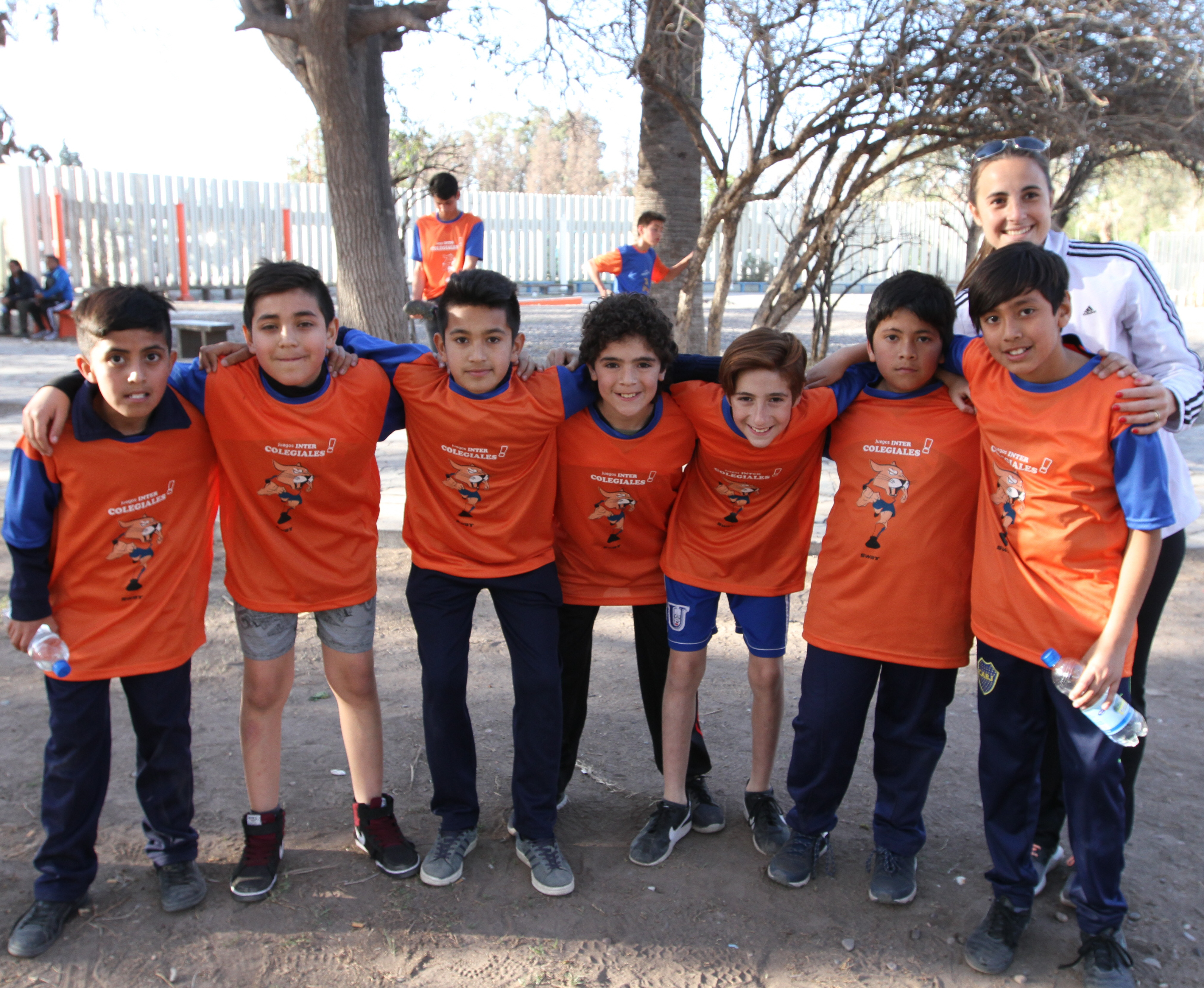 Diego Villegas, Jeremias Garramuño, Santiago Serra, Mariano Pajares, Agustín Olmos, Pablo Carrizo y Juan Castro junto a la profe Natalia Suligoy. Son de la Esc. "Mercedes San Martín de Balcarce" y competirán en fútbol.