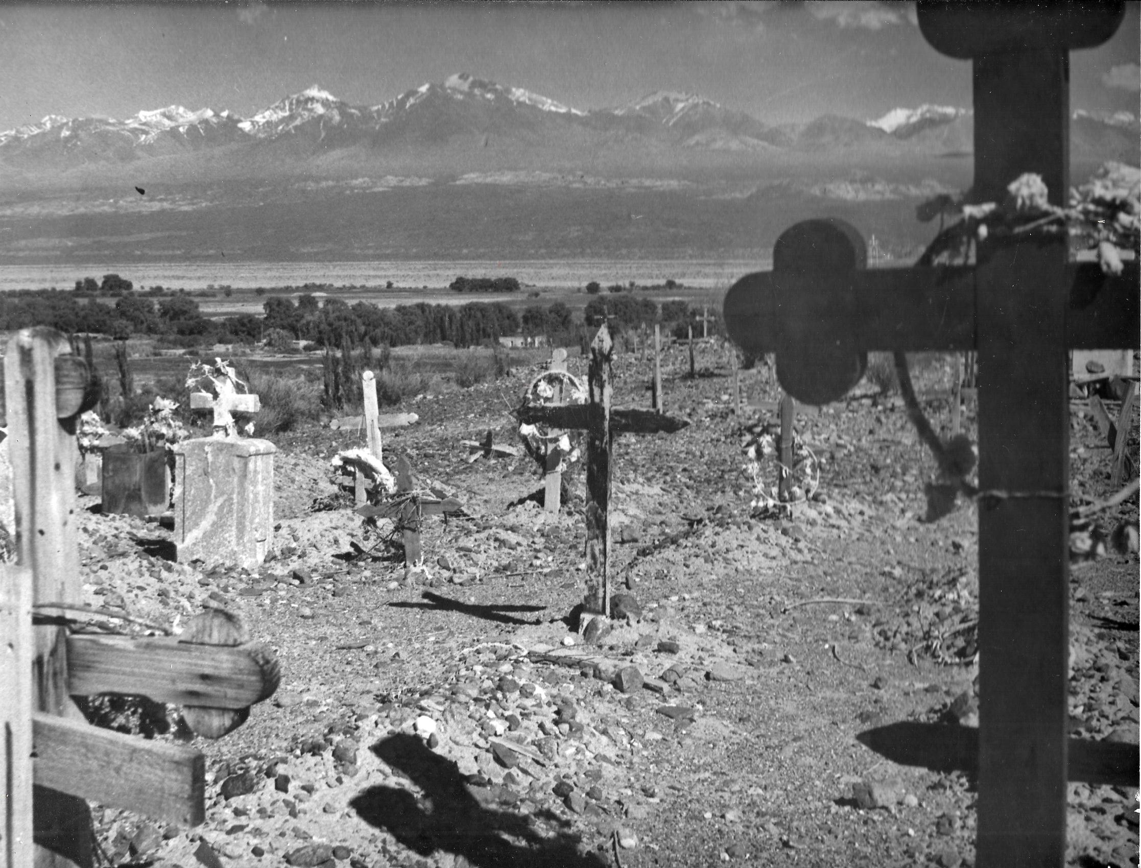Una foto que José Mazuelos retrato allá por 1942 y que generó esta nota, un campo santo en la localidad de Barreal. Allí, los mitos, leyendas y los porqué tienen explicación. Los muertos eran enterrados mirando a la cordillera, para que los sonidos del viento, casi igual a un llanto, quedaran en la falda del cerro, y la "Pachamama", cuidara de ellos. Las cruces, que eran cada una distinta a la otra y confeccionada por los deudos, indicaba que allí habían fallecidos en gracia de Dios. Cada cruz tenía enganchada una corona de flores de papel, que artísticamente confeccionaban las mujeres, madre, esposa o un pariente. El muerto, las cruces y las coronas siempre miraban a la cordillera con su lenguaje de los silencios, los respetos y las soledades.