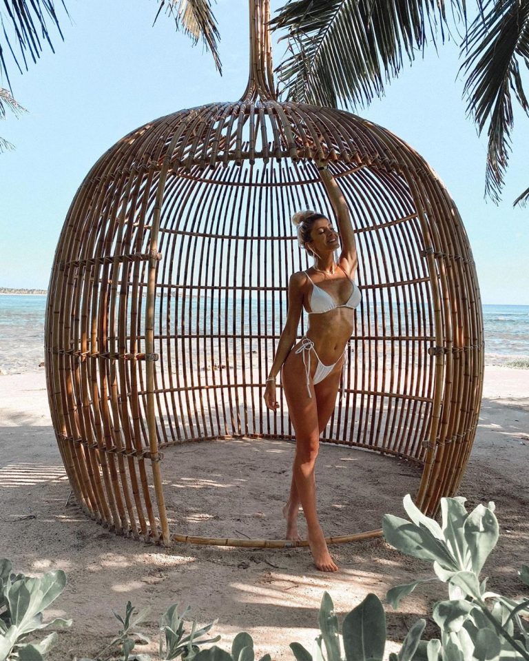 Además, “Cale” como le dicen sus seres queridos, compartió también una postal en la que se la puede ver luciendo una bikini blanca, dentro de un refugio de caña y con una postal paradisíaca de fondo.