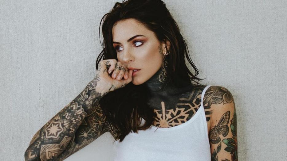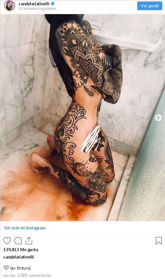 Cande compartió las dos fotos en Instagram donde se la puede ver luciendo todos sus tatuajes y eligió pintar sus partes íntimas para que no se vean.