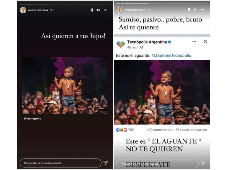 Tras el show, Viviana Canosa y el músico protagonizaron un fuerte ida y vuelta en redes sociales. Todo comenzó después de que en el perfil de Facebook de Tecnópolis compartieran la foto de un niño haciendo el típico gesto que hace el músico con las manos en alto. “Este es el aguante”, escribieron en el posteo en el que registraron el evento, resumiendo así la jornada que se había vivido.