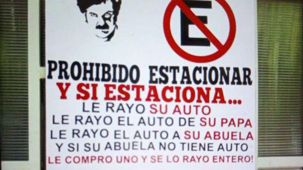 “Prohibido estacionar, y si estaciona… le rayo su auto, le rayo el auto de su papá, le rayo el auto a su abuela y si su abuela no tiene auto le compro uno y se lo rayo entero!”. Esa fue la advertencia que puso con la cara del personaje de Pablo Escobar en la serie Escobar, el patrón del mal.