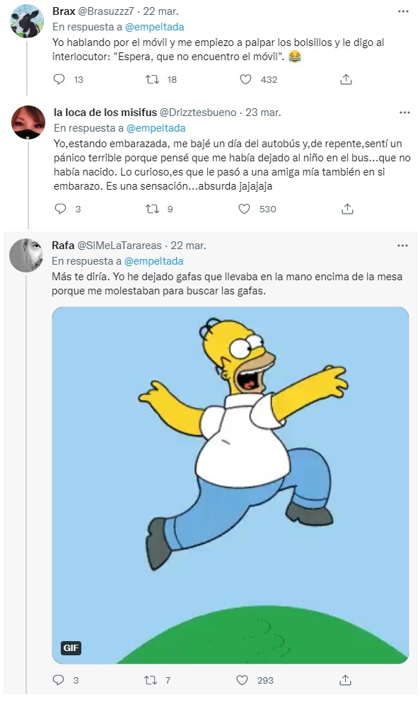 Finalmente se da cuenta de que lo tiene consigo y, aliviada, lo abraza y lo besa. El tuit ha recibido multitud de respuestas de personas que se sienten identificadas por situaciones similares.