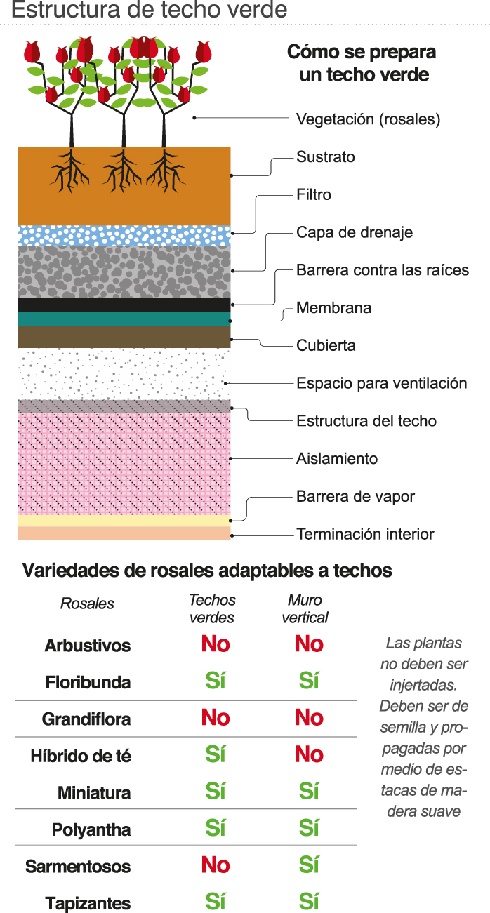 "Cada vez más comunes en las ciudades, los techos verdes permiten aprovechar terrazas y superficies de cemento para producir flores y hortalizas. Los rosales permiten aumentar la calidad y cantidad de aire, transformando integralmente el paisaje", detalló.