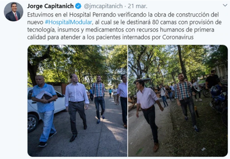 Mientras los chaqueños se acuartelaban sus casas, el funcionario se mostró muy activo y trabajando en conjunto con profesionales de la salud para combatir el COVID-19. Tan es así que, el pasado 21 de marzo, se lo vio recorriendo distintas instituciones sanitarias, entre ellas, el Hospital Perrando, junto a la Ministra de Salud de la provincia, Paola Andrea Benítez y a Nancy Trejo, la directora del hospital.