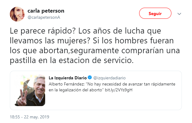 “Le parece rápido? Los años de lucha que llevamos las mujeres? Si los hombres fueran los que abortan, seguramente comprarían una pastilla en la estación de servicio”, redactó la pareja de Martín Lousteau desde la red social del pajarito.
