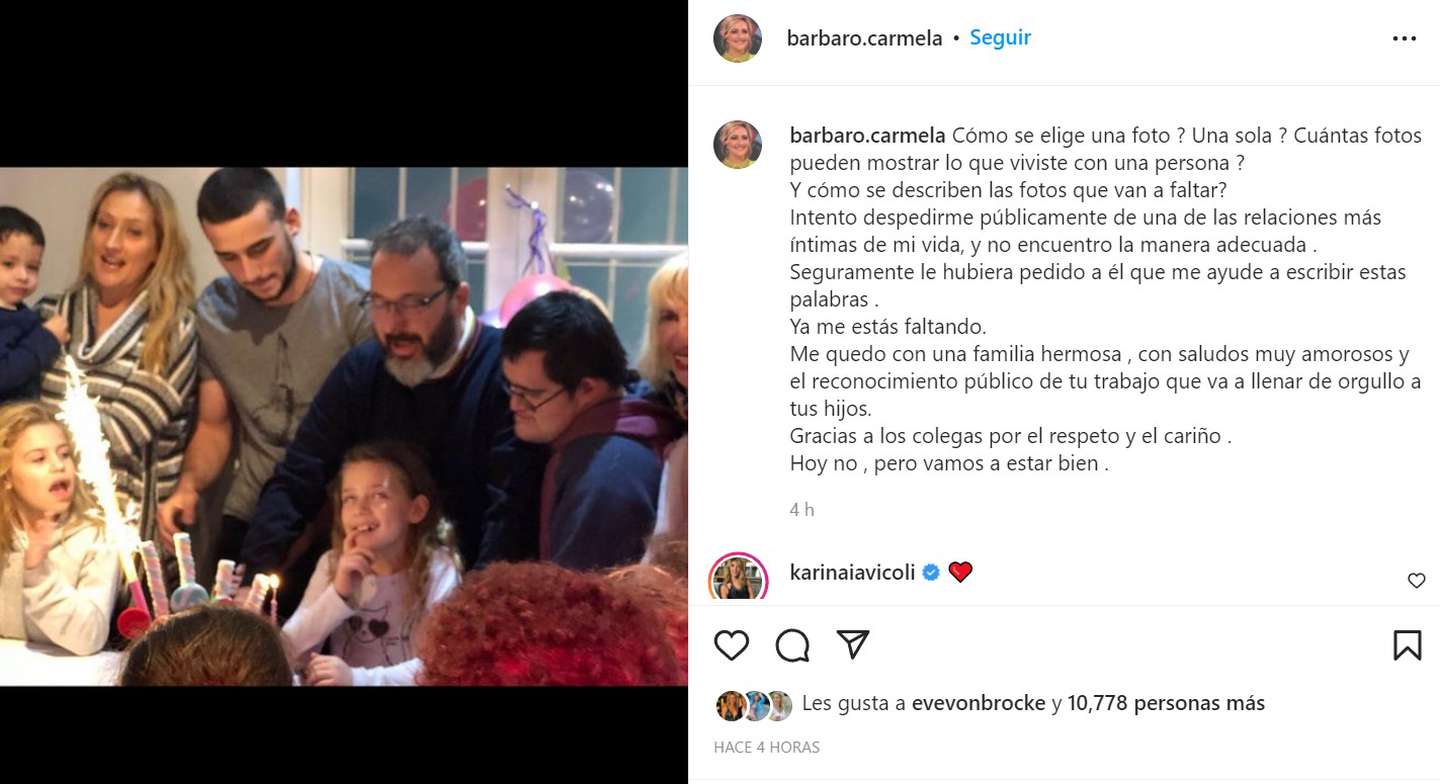 Carmela Bárbaro está devastada por la muerte de su exmarido y padre de su hija Elena, Gerardo Rozín. Desde el dolor, escribió unas conmovedoras palabras que compartió en su Instagram.