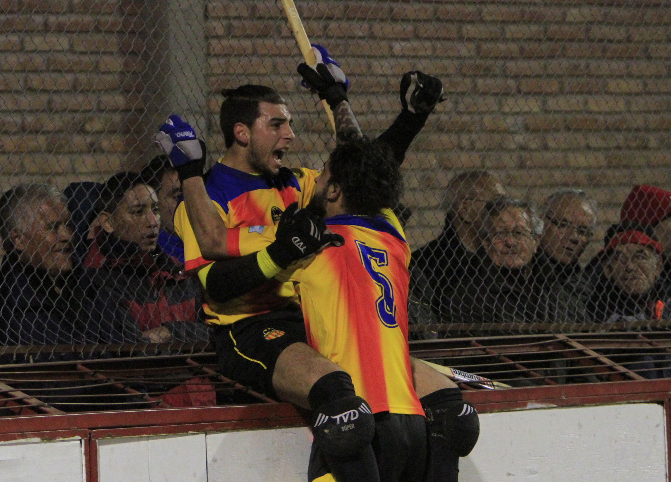 A ganar. Franco Ferruccio y Gonzalo Rodríguez festejan un gol de Valenciano. Hoy, La Barraca tiene un difícil examen en Mendoza ante Casa de Italia.