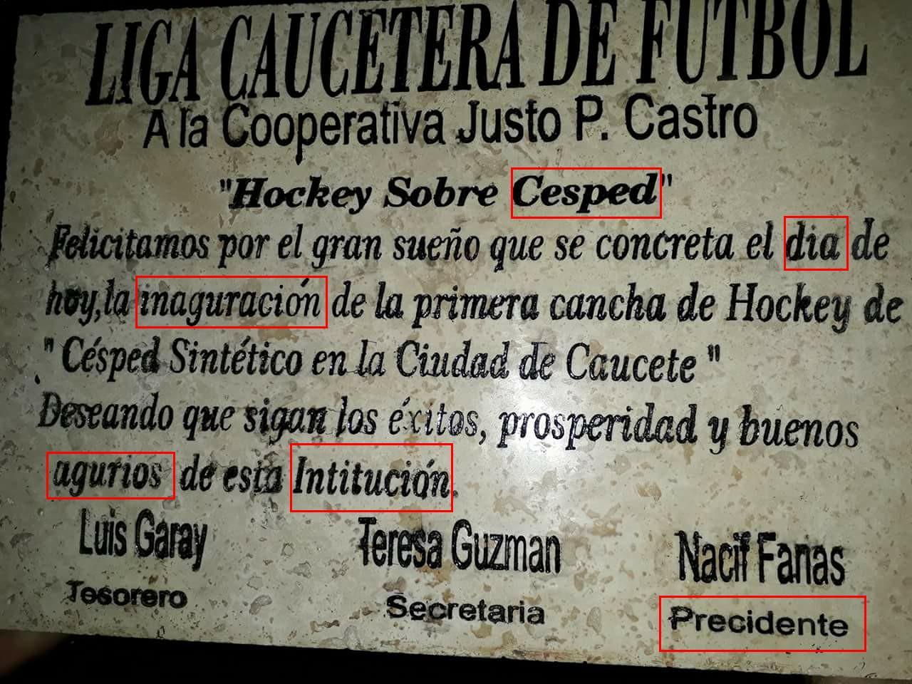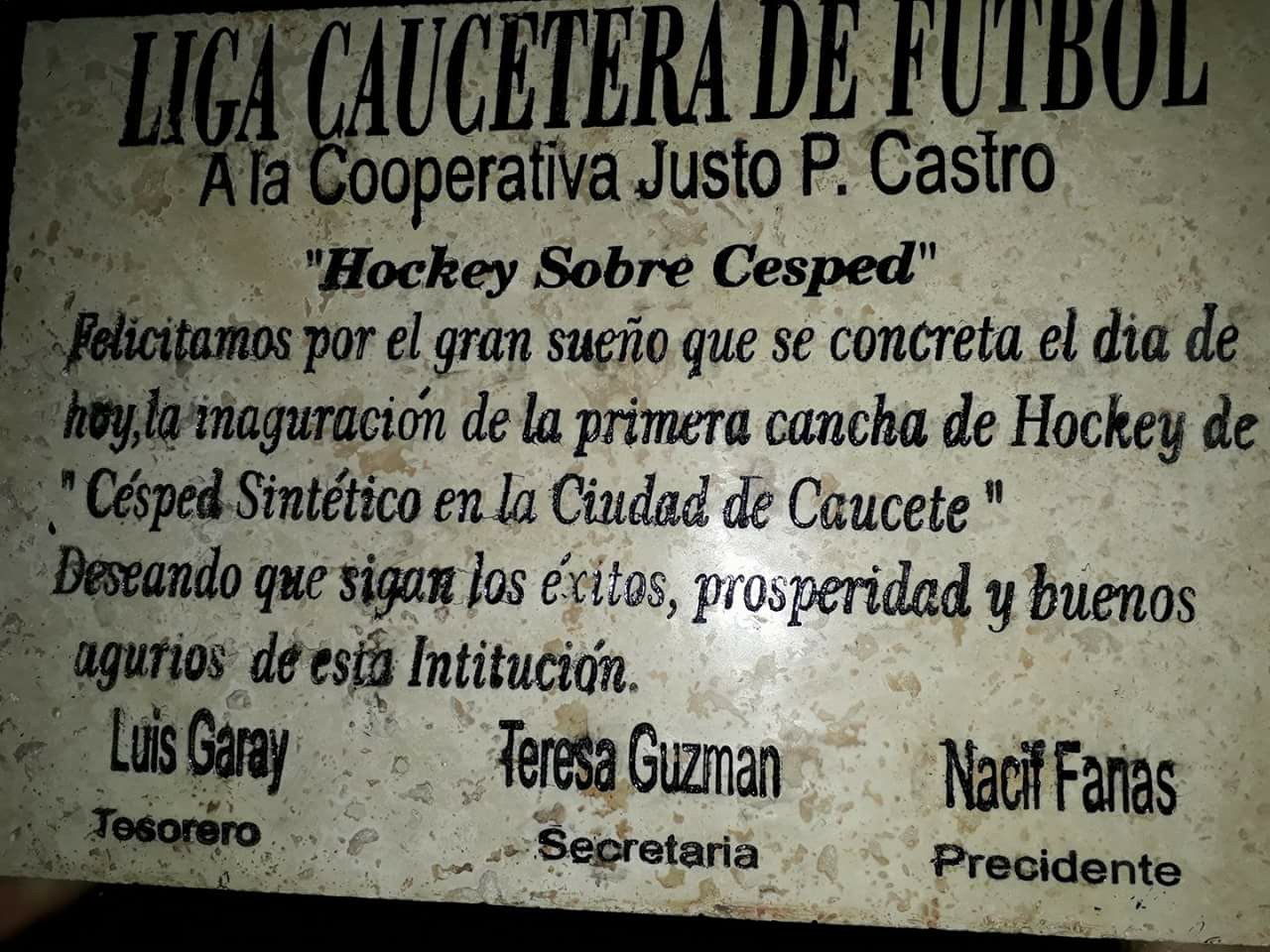 Todo debía ser una fiesta y lo fue. Sin embargo, un pequeño detalle dejó a todos boquiabiertos. Los presentes no podían creer lo que veían cuando la Liga Caucetera de Fútbol destapó su placa homenaje a la Cooperativa Justo P. Castro, luego del logro que significa haber conseguido una cancha de césped sintético para hockey, siendo la primera de la ciudad.
