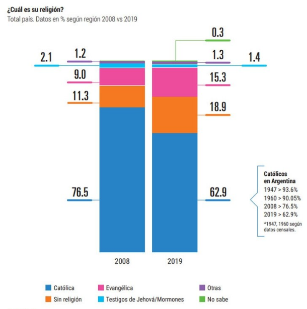 Lo cierto es que los números sobre la religiosidad se distancian cada vez más de los registros históricos. Según el censo del año 1947, la proporción de católicos en Argentina llegaba al 93,6%, en 1960, 90 por ciento y en 2008, 75,5 por ciento. El descenso estimado abarca los 30 puntos.