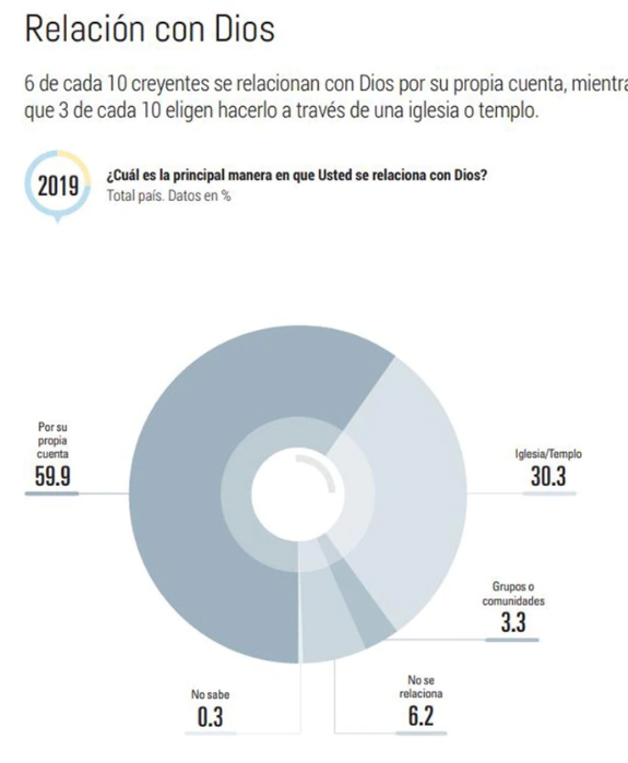 "La encuesta revela que la creencia en Dios es del 80 por ciento, a la vez que estamos en un contexto de incredulidad en las instituciones en general, de la cual las organizaciones religiosas no están exentas”. “En este sentido, eso podría explicar por qué 60% de los creyentes reconocen que su relación con Dios la manejan por su propia cuenta y 30% por medio de la asistencia a un templo”, consideró Mallimaci.