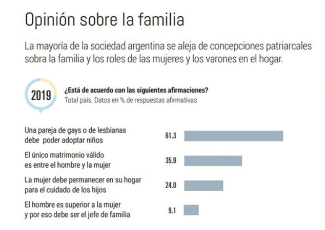 Por su lado, la mayoría de los habitantes de Argentina cuestionan las concepciones patriarcales sobre la familia y los roles de las mujeres y los varones en el hogar. El 61,3% de los consultados acepta que una pareja de gays o lesbianas “pueda adoptar hijos”, mientras que una minoría, aunque con una significativa presencia (35,9%), considera que el “único matrimonio válido debe ser entre el hombre y la mujer”.