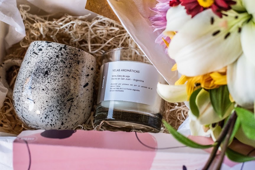Box Natural: Una vela de soja, un jabón natural zafra, ramo de flores y envío, $2.000 con adicionales $3.000.