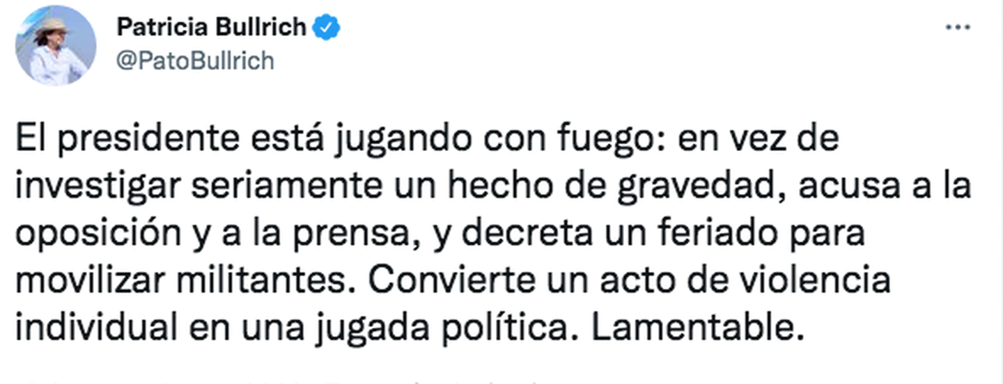 “El Presidente está jugando con fuego: en vez de investigar seriamente un hecho de gravedad, acusa a la oposición y a la prensa, y decreta un feriado para movilizar militantes. Convierte un acto de violencia individual en una jugada política. Lamentable”, sostuvo Bullrich.
