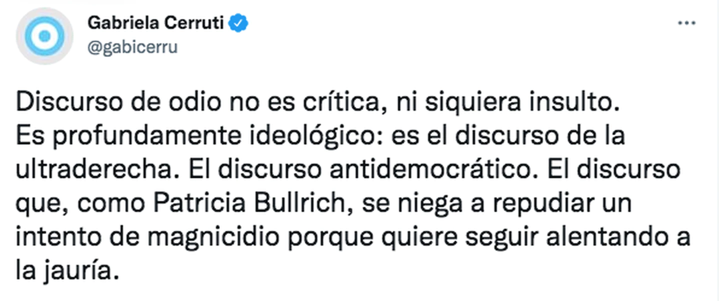 “Discurso de odio no es crítica, ni siquiera insulto. Es profundamente ideológico: es el discurso de la ultraderecha”, escribió Cerruti.