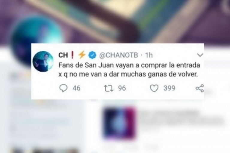 El 26 de octubre Chano pisará suelo sanjuanino con su "Chano Tour 2018". El cantante, que después del éxito de Tan Biónica se vio envuelto en una serie de polémicas, publicó un mensaje para que los sanjuaninos compren sus entradas. Lejos de generar el interés del público, cosechó una catarata de insultos.