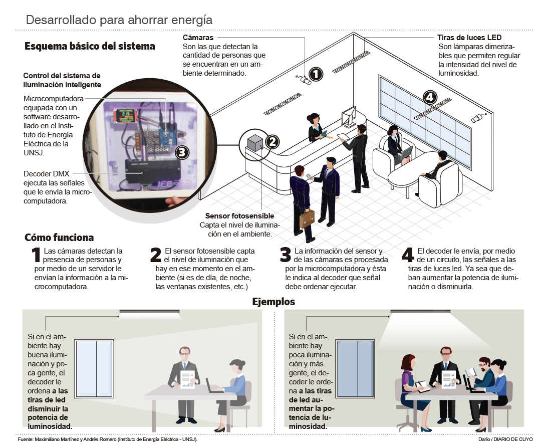 La necesidad de reducir el consumo de energía se profundizó con el tarifazo y la tecnología está brindando buenas alternativas en la provincia. Un grupo de investigadores del Conicet que trabajan en el Instituto de Energía Eléctrica de la Universidad de San Juan desarrollaron un sistema de iluminación inteligente para regular el consumo de las luces, que les ha permitido reducir el consumo eléctrico hasta un 80%, lo que ayudará a aliviar el gasto en edificios ahora que las tarifas de energía están por las nubes. El sistema ya está funcionando en ese instituto, el próximo paso es instalarlo en la Facultad de Ingeniería, y se iniciaron las conversaciones para incorporarlo al Centro Cívico, según adelantó Andrés Romero, uno de los precursores del sistema y docente del organismo. Junto a otro doctor en ingeniería eléctrica como él -Maximiliano Martínez- y un grupo de estudiantes de grado gestaron el nuevo invento que se basa en una red de sensores y una plataforma de control inteligente que permite gestionar varios dispositivos en todo el edificio. Lo que hace el sistema (ver infografía) es medir continuamente la intensidad de la luz en función de las necesidades y cantidad de usuarios que están en la sala donde está instalado, además de las condiciones ambientales, lo que permite reducir de manera notable el consumo eléctrico. Si el sistema inteligente detecta que está nublado por ejemplo, aumenta la intensidad de la iluminación; y si el día está radiante, las reduce automáticamente. Del mismo modo, a través de los sensores con que cuenta, al detectar mayor presencia humana aporta la luz necesaria para un confort visual óptimo (unos 200 lux), mientras que cuando no hay gente, la reduce a una luz de emergencia (50 lux). El dispositivo central puede intervenir en varios dispositivos por lo que el sistema no se limita a pequeños espacios sino que puede destinarse a grandes inmuebles. Romero explicó que el proyecto surgió en el año 2017 de una tesis de grado, con el objetivo de desarrollar ""un producto útil para la sociedad y aplicable inmediatamente". Tras cambiar los tradicionales tubos fluorescentes por tiras LED lograron reducir de inmediato un 50% el consumo. Detectaron que la nueva iluminación tenía demasiada intensidad (500 lux) y con el sistema inteligente la bajaron a 200 lux, logrando un ahorro extra de 20%. Cuando el sistema detecta ausencia de gente se coloca en "luz de emergencia" y ahorra otro 10% llegando así a un ahorro del 80% desde el escenario original con tubos fluorescentes. El proyecto se terminó en diciembre de 2017, demandó una inversión de 40 mil pesos y fue financiado mitad por la Universidad Nacional de San Juan y mitad por la Secretaría de Ciencia y Tecnología. El grupo ahora está inmerso en el desafío de hacerlo autónomo y (ver recuadro), con el uso de paneles solares.