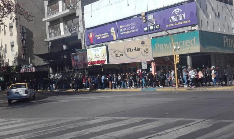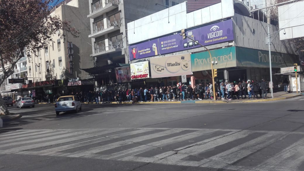 Desde antes del mediodía, cientos de sanjuaninos fueron parte de una larga fila en el microcentro capitalino que llamó la atención a propios y extraños. La cola arrancó en el Hotel Albertina, en calle Mitre, continuó por Mendoza hacia el Sur y se extendió por Santa Fe con sentido al Este.