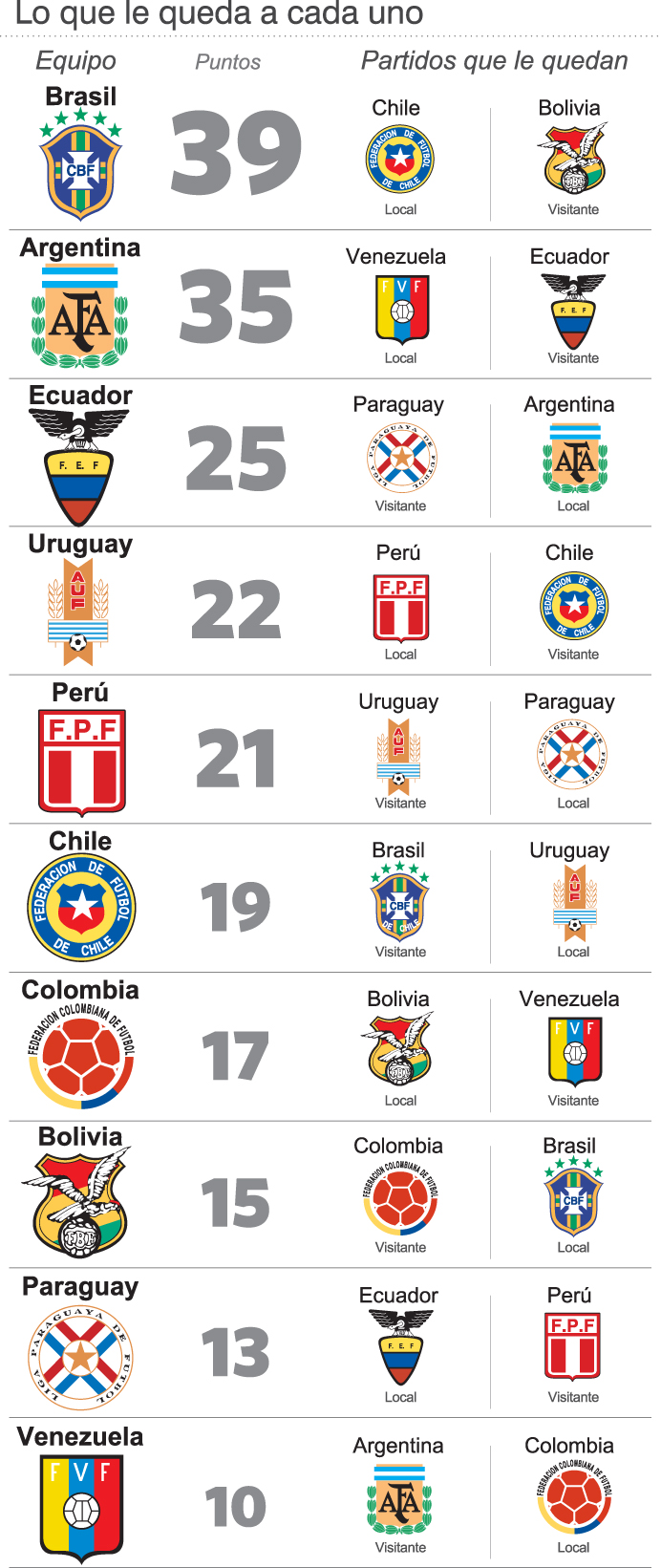 Los que siguen con chances y se la deben jugar en esta doble fecha que resta son: Ecuador, Uruguay, Perú, Chile y Colombia.